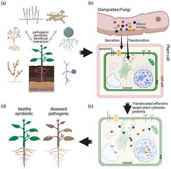 Phytopathogens and mutualistic microbes like filamentous fungi and oomycetes secrete effector proteins in order to colonize the host. Bioinformatic approaches allow us to predict effectomes from genome and RNA sequencing data sets, which is based on known signal peptides, effector motifs and domains (see below Section 2.2). Ultimately, these data sets are the starting point to explore effectors and their biological and biochemical functions. Depending on the host-range (specialist or broad range), fungi and oomycetes have both highly conserved and unique effector proteins. This allows them to target critical mechanisms involved in the plant’s immune system, stress adaptation pathways and regular cellular functions important to establish and survive on the host plant [,,]. In the past decade, effectomes have been published for a wide range of pathogenic species, including dieback inducing species, rusts and smut fungi [,]. Recently, effectome sets are increasingly published for symbiotic and mutualistic microorganisms, allowing us to compare the molecular colonization strategies of pathogens and mutualistic microbes [,].