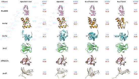 The predicted structures of PexRD2, Avr1d, Avr3a, Avr2, ApiKL2a and AvrP using AlphaFold2 Google colab version, AlphaFold2 full version, RoseTTadfold Google Colab version and RoseTTafold full version and their RMSD and GDT-TS values calculated when superimposing models with their PDB structures. The following methods were used to model the structures: AlphaFold2_advanced Google Colab notebook [] with the settings of: MSA_method: MMseq2 (fast method), max_msa: 512:1024, num_models: 5, active use_ptm, num_ensemble: 1, max_recycles: 3, num_relax: Top1, NeSI (New Zealand eScience Infrastructure) AlphaFold2 full version [], RoseTTafold Google Colab notebook [] with the setting of: MSA_method: MMseq2, and RoseTTafold Robetta server [] and the RMSD value (blue) of the superimposition of the proteins PDB structures and their corresponding models calculated by PDBefold [,]. GDT-TS (red) was calculated using the online LGA (Local-Global-Alignment) program []. UCSF Chimera version 1.15 [] was used to visualize the models.