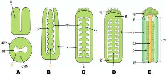 Model diagram elaborating ovule formation in Arabidopsis. The instance specifies ovule formation and developmental stages. (A) CMM formation, (B) ovule identity, (C) ovule initiation, (D) integument development, and (E) gynoecium development. Abbreviations: ab, abaxial; ad, adaxial; b, boundary; CMM, carpel margin meristem; c, carpel; gy, gynoecium; o, ovule; op, ovule primordium; ov, ovary; p, placenta; s, septum; sg, stigma; st, style; tt, transmitting tract; v, valve. The region of the CMM where the placenta is formed is indicated with orange lines. The ovule initiation and gynoecium developmental process are according to [3,6].