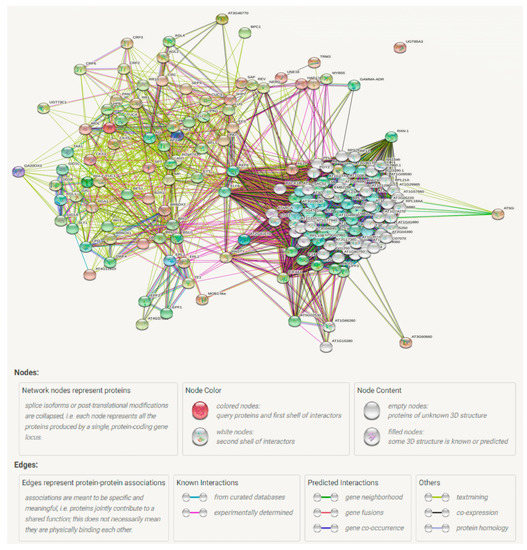 Protein interaction network constructed for ovule number genes. The figure shows different action types and effects, which are represented by different colors of lines and arrows between different genes/proteins. For example, the blue-colored lines/arrows show binding, green color represents activation while red color shows inhibition, black color represents reaction between different genes, and so on. The different types of arrows indicate the positive, negative and unspecified effects of genes.