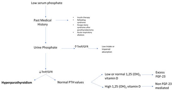 For the clinician approaching phosphate alterations, it is important to know that approximately 80% of filtered phosphate is reabsorbed in the proximal tubule and <10% in the distal segments of the nephron [11]. Renal reabsorption of phosphate progressively increases as the filter load increases, with filtered phosphate reaching at some point a maximum tubular reabsorption rate or TmP. Because TmP depends on renal function, the correct parameter to estimate phosphate renal tubular reabsorption is TmP/GFR. If TmP/GFR is low despite low serum phosphate, this means that the kidney is wasting phosphate. This ratio should be calculated from fasting serum phosphate and creatinine and a second void urine sample. In patients with hypophosphatemia, fractional excretion of phosphate (FEP) may also be useful. FEP can be calculated from the following formula: FEP = (Urinary Phosphate × Plasma Creatinine)/(Plasma Phosphate × Urinary Creatinine). When low serum phosphorus is diagnosed, a rule of thumb is that FEP > 5% or 24-h Urinary Phosphate > 100 mg; both can be used to confirm increased renal tubular phosphate loss [5]. A diagnostic flowchart for hypophosphatemia is shown in Figure 2 to guide classification of the underlying disorder. Of note, intestinal malabsorption of phosphorus, phosphorus redistribution into cells, and increased loss through the kidney are the three most common mechanisms behind hypophosphatemia.