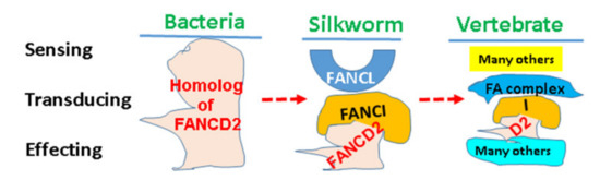 - Sugahara, R.; Mon, H.; Lee, J.M.; Kusakabe, T. Monoubiquitination-dependent chromatin loading of FancD2 in silkworms, a species lacking the FA core complex. Gene 2012, 501, 180–187. [Google Scholar] [CrossRef] [PubMed]