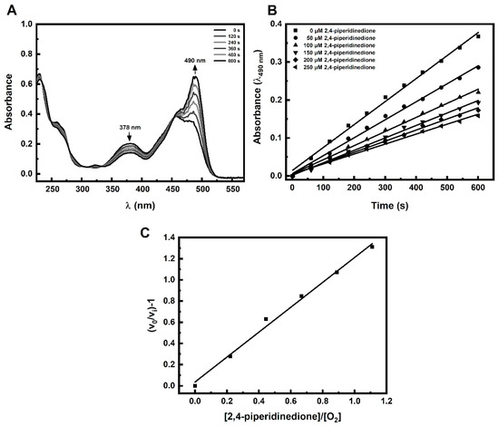(A) Changes in the absorption spectrum due to oxidation of a boronate probe (FlBA) in an aerated aqueous solution of Angeli’s salt in the absence of HNO scavengers. (B) An example of the effect of an HNO scavenger 2,4-piperidinedione on the initial rate of fluorescein formation from the FlBA boronate probe. (C) Example plot of (v0/vi) − 1 versus the [S]/[O2] ratio. The reaction mixture contained: 25 µM FlBA, 20 µM Angeli’s salt, 2,4-piperidinedione (0–250 µM), phosphate buffer (pH 7.4, 50 mM), dtpa (100 µM). Each solution contained 5% (vol.) CH3CN. The concentration of molecular oxygen was assumed to be 225 µM. Measurements were carried out at 25 °C.