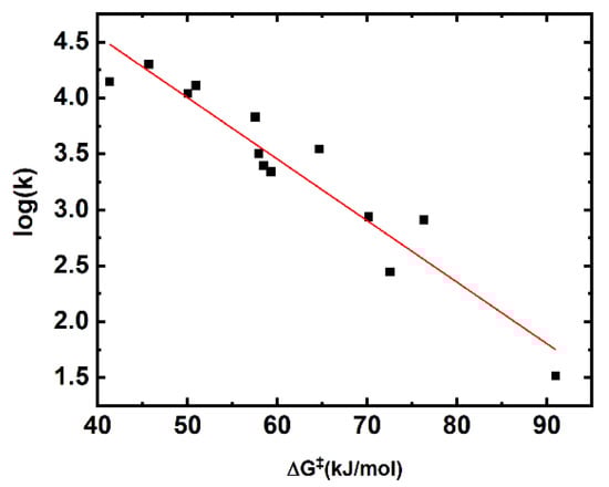 Linear correlation of the computationally determined barrier heights (B2PLYP-D3/6-311+(2df,2p)) versus log(k).