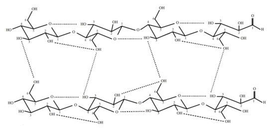 Hydrogen bonds are plentiful within cellulose (Figure 1) due to the presence of a large number of oxygen atoms and hydroxyl groups [18]. Parallel stacking is observed within cellulose due to the presence of van der Waals force that helps in the development of crystalline nanofibers followed by the development of microfibrillar structure [19]. The presence of the supercoil structure helps in promoting the hierarchical orders that help in providing a very high amount of mechanical strength to cellulose [20].