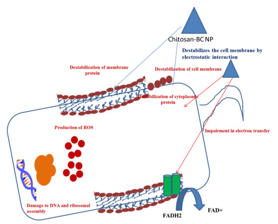 Chitosan is considered an antibacterial agent as it is able to bind to the negatively charged bacterial cell wall, leading to the alteration of cell permeability and cell disruption (Figure 3). It also becomes attached to the DNA of the cells, resulting in the inhibition of DNA replication and cell apoptosis [111]. Furthermore, chitosan acts as a chelating agent, which binds to the metal elements of the cell and exhibits toxin production, resulting in inhibition of microbial growth [112]. The polycationic structure of the chitosan is responsible for the antibacterial activity [113,114]. The pH below the pKa of the chitosan-based BC composite helps the electrostatic interactions between the composite and the anionic components of the microorganisms. This is the principle of the antibacterial activity of the chitosan-based BC composite [115]. A higher pH condition is responsible for the protonation of chitosan, resulting in an increase in the antibacterial properties. Apart from protonation, the linkage between the amino groups and C-2 on chitosan backbones is required for electrostatic interactions. The incorporation of amino groups enhances antimicrobial activity of the composite. Asparagine N-conjugated chitosan oligosaccharide has two positively charged sites, which allow stable interaction with carboxyl-negative charges on the bacterial cell wall [116]. Chitosan, along with nanoparticles, alter cell permeability by interacting with the cell surface and interrupting the entry of the essential solute into the cells.
