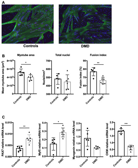 Troponin T immunostaining (a cytoskeletal protein expressed exclusively in myotubes) and nuclei labeling showed a similar mean number of nuclei in cultured myotubes from healthy boys (controls, n = 5) and boys with DMD (n = 6) (Figure 1A) (481.7 ± 37 nuclei/mm2 and 445.8 ± 55 nuclei/mm2, respectively, p = 0.6), but a reduction in the myotube area (Troponin T expressing cells; 0.518 ± 0.036 mm2 and 0.394 ± 0.033 mm2, p = 0.035) and fusion index (nuclei per myotube/total nuclei; 76.8 ± 2.9% and 66.2 ± 2.3%, p = 0.005) in DMD samples (Figure 1B). To further analyze the muscle differentiation stages, we characterized the expression of genes implicated in this process by reverse transcription quantitative PCR (RT-qPCR) (Figure 1C) and found that the expression of PAX7 (controls 0.0031 ± 0.001 and DMD 0.0078 ± 0.001, p = 0.013) and MYF5 (controls 0.175 ± 0.014 and DMD 0.285 ± 0.033, p = 0.043), two transcription factors expressed at immature stages, increased, and the differentiation markers CKM (controls 1.85 ± 0.14 and DMD 0.64 ± 0.1, p = 0.001) and myogenin (controls 1.305 ± 0.456 and DMD 0.694 ± 0.070, p = 0.2) decreased in DMD samples compared with controls, although the latter was not significant [20,21]. This indicated that myogenic differentiation was delayed in DMD samples.