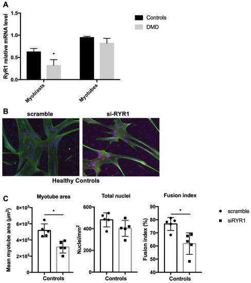 In order to determine whether RYR1 is required for human myoblast differentiation, we transfected confluent control and DMD myoblasts with a RYR1-specific siRNA (siRYR1) or with scramble siRNA. In both controls and DMD myotubes, the RYR1 mRNA level decreased by 63–67% in cultures transfected with the RYR1 siRNA compared with scramble siRNA. In addition, siRYR1 efficiently decreased RYR1 protein levels (Supplementary Materials, Figure S2). Even if we cannot explain how the partial reduction in RYR1 mRNA causes a complete absence of the RYR1 protein detection, we cannot rule out the possibility of translational regulation that could differentially modulate the amount of RYR1 protein. Immunostaining control myoblasts transfected with siRYR1 or scramble siRNA did not reveal any differences in the total number of nuclei between conditions, but RYR1 silencing induced a decrease in myotube area (−39.8%, p = 0.03) and fusion index (−19.8%, p = 0.03) (Figure 2B,C). In DMD cells, RYR1 silencing affected myoblast differentiation (Supplementary Figure S3), suggesting that RYR1 is required for myogenesis also in DMD myoblasts. Altogether, these data indicate that RYR1 mRNA expression level changes during the early stages of myogenesis and that RYR1 is required for myogenic differentiation in healthy and also dystrophic skeletal muscle.
