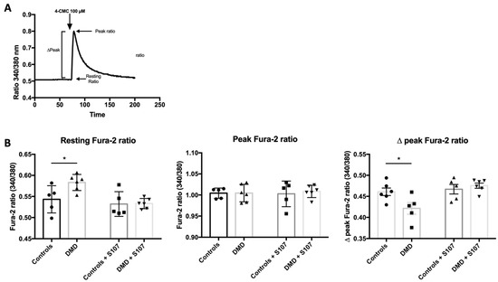 Human DMD myotubes exhibit resting RYR1-mediated calcium leakage that is improved by the RYR stabilizer S107. (A) Experimental design: in cultured myotubes loaded with Fura-2, intracellular Ca2+ changes were induced by an addition of 4-CMC and monitored by recording the Fura-2 signal emission at 340 and 380 nm. The signal intensities at 340 and 380 nm were used to calculate the signal 340/380 ratio at rest, the peak fluorescence ratio and the ∆Peak. (B) Quantification of the resting, peak and ∆Peak Fura-2 (340/380) ratio values in untreated and S107-treated myotubes from healthy controls (n = 5) and patients with DMD (n = 6). * p < 0.05.