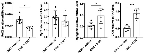 In order to thoroughly investigate S107 effects, we monitored the expression of regulatory myogenic factors by RT-qPCR in myotubes obtained by differentiating myoblasts in the presence or not of 10 µM of S107. The expression of the early myogenic regulatory markers Pax7 (controls 0.0076 ± 0.0011 and S107 0.004 ± 0.0003, p = 0.02) and to a lower extent (not significant) Myf5 (controls 0.284 ± 0.066 and S107 0.232 ± 0.053, p = 0.5) was reduced in S107-treated compared with untreated DMD cells. Conversely, the expression of terminal differentiation markers, such as myogenin (controls 0.555 ± 0.054 and S107 0.969 ± 0.136, p = 0.02) and CKM (controls 0.513 ± 0.955 and S107 1.387 ± 0.155, p = 0.003), increased (Figure 4). These data support the hypothesis that delayed myogenic differentiation in DMD skeletal muscle cells could be improved by stabilizing calstabin1 binding to RYR1 to prevent Ca2+ leakage.