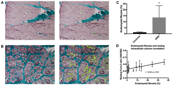 Endomysial fibrosis is correlated with elevated resting intracellular calcium concentration. (A,B) Representative images showing color segmentation of muscle sections stained with Masson trichrome (left) and with pseudo-color (yellow) to highlight endomysial fibrosis (right) in one healthy control muscle biopsy (A) with minimal (1.7%) endomysial fibrosis (biopsy of a 10-year-old boy) and one DMD muscle biopsy (B) with advanced (24%) endomysial fibrosis (biopsy of a 5-year-old boy). (C) Quantification of endomysial fibrosis in muscle biopsies of healthy controls (n = 5) and patients with DMD (n = 6). ** p < 0.01. (D) Correlation between the endomysial fibrosis rate and the Fura-2 ratio at rest in patients with DMD (n = 6, triangles) and healthy controls (n = 5, circles) (Spearman’s rank correlation coefficient r = 0.56, p < 0.01).