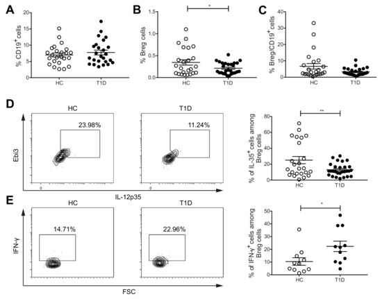 Proportions of IL-35+ and IFN-γ+ Breg cells are altered in subjects with T1D compared with healthy controls (HC). PBMCs were isolated from peripheral blood of subjects with T1D and HC. Cell proportions were determined by flow cytometry. (A) The proportions of CD19+ cells. (B) The proportions of CD19+CD24+CD40+CD38+ Breg cells. (C) The proportions of CD19+CD24+CD40+CD38+ Breg cells among CD19+ cells. (D) The proportions of IL-35+ cells among CD19+CD24+CD40+CD38+ Breg cells and representative dot plots. (E) The proportions of IFN-γ+ cells among CD19+CD24+CD40+CD38+ Breg cells and representative dot plots. Results are expressed as means ± SEM. Mann–Whitney tests were performed for (C,E). Unpaired t-tests were performed for (A,B,D). * and ** denote p < 0.05 and p < 0.01, respectively.