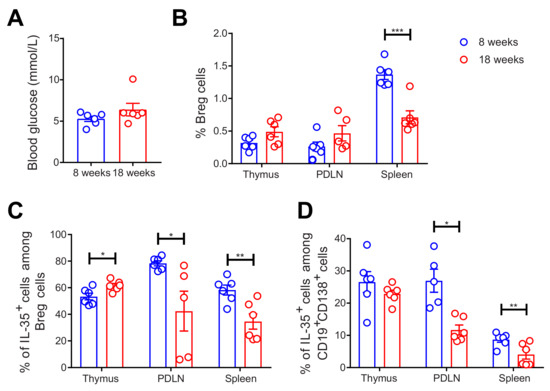 Next, we investigated the Breg response in NOD mice. Thymi, PDLNs, and spleens were collected from 8-week-old and 18-week-old female mice. The thymic glands were investigated since thymic B cells play a pivotal role in the development of hyperglycemia in NOD mice [29]. Thus, we investigated the presence of Breg cells in the thymic glands and determined the proportion of Breg cells in the thymic glands. Herein, we used 18-week-old mice and compared them to 8-week-old mice as hyperglycemia in NOD mice is established after 8 weeks [30]. As expected, the 18-week-old mice had slightly higher blood glucose levels than the younger mice (Figure 2A). The proportion of CD19+CD1d+CD5+ Breg cells was decreased in the spleens of the 18-week-old mice (Figure 2B). Although there was a slight increase in the percentage of IL-35+ cells among the Breg cells in the thymi of the 18-week-old mice, we found a substantial decrease in these cells in both the PDLNs and spleens of the 18-week-old mice (Figure 2C). Shen et al. have reported that CD138+ plasma cells express IL-35 [10], and we found that the proportions of IL-35+ cells among CD19+CD138+ cells were decreased in the PDLNs and spleens of 18-week-old mice (Figure 2D). There was no difference in the proportions of IL-10+ cells among Breg cells and CD19+ cells (Supplementary Figure S7A). All in all, our data reveal that IL-35+ Breg cells are decreased more in 18-week-old than in 8-week-old female NOD mice.