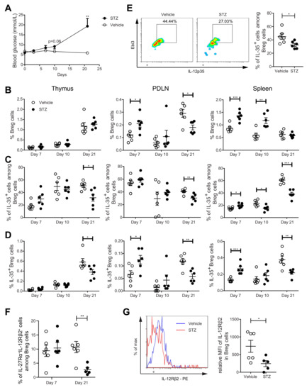 To study the kinetic response of Breg cells during the development of T1D, we used MLDSTZ mice. Male CD-1 mice were injected with MLDSTZ intraperitoneally for five consecutive days. Thymi, PDLNs, and spleens were collected on days 7, 10, and 21 after the first STZ injection. The mice gradually developed hyperglycemia (Figure 3A), which is consistent with our previous reports [26,31]. We found that the proportions of CD19+ CD1d+CD5+ Breg cells were increased on day 7 in the PDLNs and spleens of the MLDSTZ mice and on day 10 in the spleens of the MLDSTZ mice (Figure 3B). The initial increase in the Breg proportion was transient. The proportions of Breg cells were decreased on day 21 in the PDLNs of the MLDSTZ mice (Figure 3B). Next, we investigated the kinetics of the IL-35+ Breg cell proportions. The proportions of IL-35+ cells among Breg cells were increased on day 7 in the spleens of the MLDSTZ mice. However, the percentages were decreased on day 10 in the spleens, and on 21 in all three organs of the MLDSTZ mice (Figure 3C). Thus, we observed increased IL-35+ Breg cell proportions on day 7 in the PDLNs and spleens of the MLDSTZ mice, and a decreased IL-35+ Breg cell number on day 21 in all three organs of the MLDSTZ mice (Figure 3D). We also isolated CD19+ B cells from the splenocytes of the mice killed on day 21. These cells were stimulated with CD40L and LPS and cultured for 72 h. Following this, the cells were harvested and analyzed using flow cytometry. We found the proportions of IL-35+ cells among Breg cells to be lower in the cells isolated from MLDSTZ mice (Figure 3E). IFN-γ and IL-35 were detected in the culture supernatants, but there was no difference in their concentrations between the vehicle and STZ mice (Supplementary Figure S8A,B).