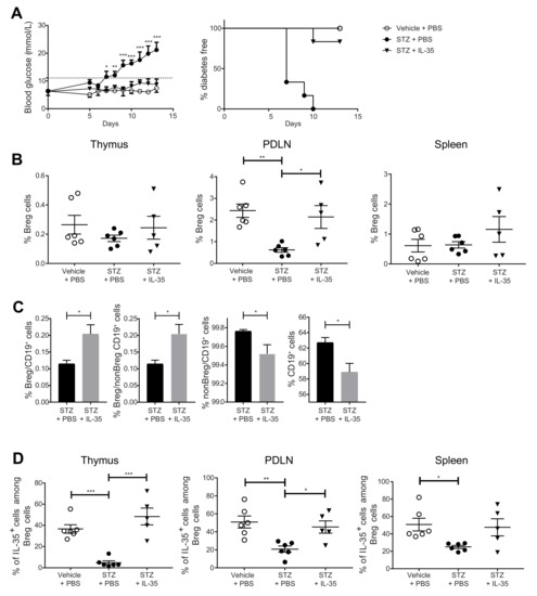 We have previously reported that the administration of IL-35 prevents and reverses diabetes in MLDSTZ and NOD mouse models of T1D [26]. In the present study, we investigated the Breg cell response after IL-35 treatment. One day after the fifth daily STZ injection, the mice received an IL-35 or PBS injection for eight days. The blood glucose concentrations were measured daily. Thymi, PDLNs, and spleens were harvested from mice on the next day after the last treatment. In line with our previous results [26], MLDSTZ mice gradually became diabetic, and IL-35 injection prevented the development of diabetes except for one mouse (Figure 4A). In the MLDSTZ mice, the Breg cell proportion was decreased in PDLNs, and IL-35 treatment prevented the decrease (Figure 4B). We also measured the percentage of Breg cells among CD19+ cells and the percentage of Breg cells among non-Breg CD19+ cells and found them both elevated in the spleens of the IL-35-treated mice (Figure 4C). On the contrary, IL-35 treatment decreased the percentages of non-Breg cells among CD19+ cells and of CD19+ cells (Figure 4C). STZ injection decreased the proportions of IL-35+ cells among Breg cells in all three organs, and IL-35 treatment prevented such a decrease in the thymi and PDLNs (Figure 4D). Likewise, STZ injection decreased the proportions of IL-10+ cells among the Breg cells in the thymi and PDLNs (Supplementary Figure S7D), but no difference in the proportions of the IL-10+ cells among the CD19+ cells was found (Supplementary Figure S7E). The IL-35 treatment caused a tendency for an increase in the proportions of IL-10+ cells among Breg cells when compared with STZ + PBS-treated mice (Supplementary Figure S7D). We also found that IL-35 treatment reversed the elevated proportions of IFN-γ+ cells among CD4+CD25− cells and CD8+ cells (Supplementary Figure S9A,B). Thus, our data indicate that Breg cells play a role in preventing the development of experimental T1D.