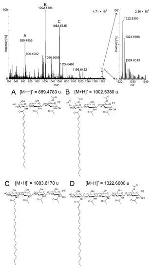 ESI-MS spectrum of purified biofertilizer (fraction eluted with 60% acetonitrile) in positive polarity. (A–D)—chemical formulas of Nod factors identified.