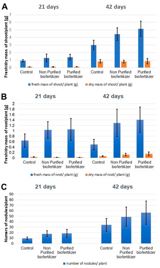 The influence of biofertilizers on the plant development of fresh and dry mass is presented in Figure 2. The obtained results indicate that supplementation of plants (seeds) with the Nod factors-containing biofertilizers has a beneficial effect on plant growth. The strongest differences in fresh and dry mass of plants’ shoots and roots were visible after 42 days of growth. Treatment of seeds with purified biofertilizer improved the shoots growth twice compared to the control (Figure 2A). The fresh and dry mass of roots from plants treated with non-purified and purified biofertilizer increased more than twice compared to the control (Figure 2B). This trend is also visible in the growth of younger plants (after 21 days of growth) The increased number of nodules per plant correlates with increased fresh and dry mass of shoots and roots of plants treated with biofertilizers in comparison to the control (Figure 2C).