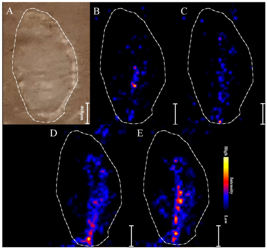 MALDI MSI images of distribution of the metabolites within root nodule: (A) Photograph of a root nodule section on a glass slide covered with DHB matrix and chemical maps of: (B) asparagine (133.06 m/z), (C) indole-3-butyric acid (204.1 m/z), (D) hesperetin (303.02 m/z), and (E) leghaemoglobin (617.17 m/z) of 21-day root nodule from plant grown from seeds coated with the non-purified biofertilizer.