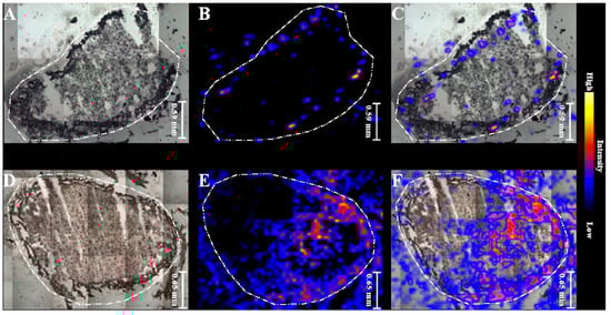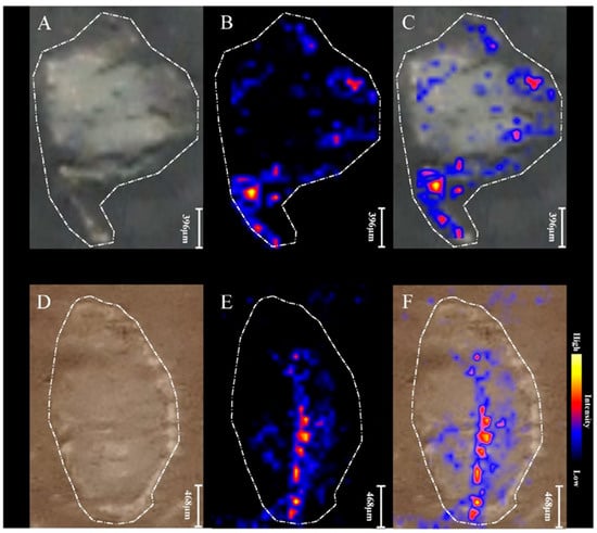 MALDI MSI images of 21-day old root nodules from plants grown from seeds coated with non-purified biofertilizer (D–F) vs. 21-day old root nodules from control sample (A–C). (A,D) Photographs of a root nodule sections on a glass slides covered with DHB matrix; (B,E) MALDI-MSI chemical maps of leghaemoglobin (617.17 m/z); (C,F) overlapped all individual chemical images.