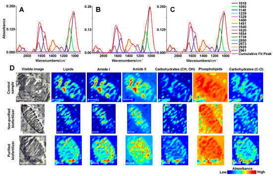 FT-IR deconvoluted spectra and chemical maps of the root nodules. (A) deconvoluted, average spectrum of the control sample; (B) deconvoluted, average spectrum of the nodule from plant grown from seeds coated with non-purified biofertilizer; (C) deconvoluted, average spectrum of the nodule from plant grown from seeds coated with purified biofertilizer; (D) chemical maps presenting the distribution of the selected bands on the root nodules. Each line of the spectra contributes to different band. The white scale bar is 750 µm.