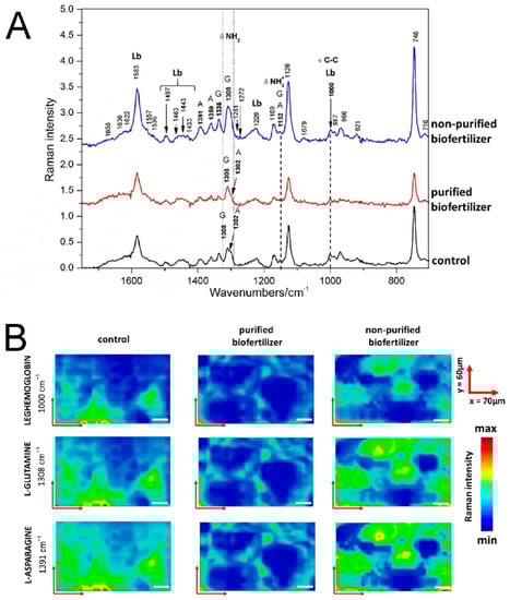 (A) Raman relative intensity spectra of the root nodules from plants grown from seeds soaked with water (control sample, black line), nodule from plant grown from seeds coated with purified biofertilizer (red line) and nodule from plant grown from seeds coated with non-purified biofertilizer (blue line). A—asparagine, G—glutamine, Lb—leghaemoglobin. Spectra are presented in the range of 1750–700 cm−1. (B) The Raman maps of the root nodules obtained for bands representing leghaemoglobin (1000 cm−1), glutamine (1308 cm−1) and asparagine (1391 cm−1) for control sample and root nodules from plants grown from seeds coated with purified and non-purified biofertilizer. Each map has the dimension 70 µm × 60 µm, white bar has 10 µm.