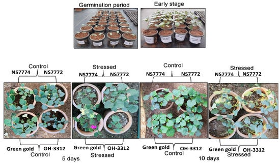 Morphological representation of okra genotypes NS7774, NS7772, Green Gold, and OH3312. Photographs represent the early germination period, early stage and vegetative stage induced by drought stress along with control plants. A total of 5 days represent an early stage, and 10 days represent the late stages of the drought period.
