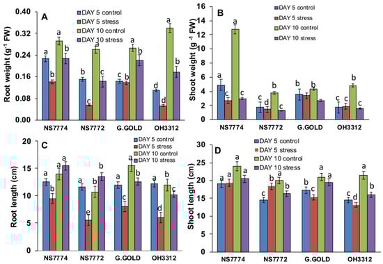 Changes in (A) root weight, (B) shoot weight, (C) root length, and (D) shoot length, as affected by drought stress at 5 and 10 days of interval in okra genotypes NS7774, NS7772, Green Gold and OH 3312 as along with their controls. Vertical bars indicate mean ± SE for n = 5. Means denoted by a different letter are significantly different at p ≤ 0.05 according to the Tukey’s studentized range test.