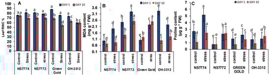 Changes in (A) relative water content, (B) Malanoaldehyde content, and (C) proline content, as affected by drought stress at 5 and 10 days of interval in okra genotypes NS7774, NS7772, Green Gold, and OH3312, along with respective controls. Vertical bars indicate mean ± SE for n = 5. Means denoted by the different letter are significantly different at p ≤ 0.05 according to the Tukey’s studentized range test.