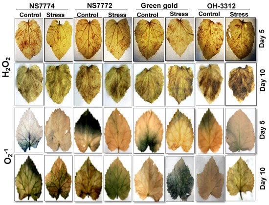 Histochemical localization of oxidative stress markers H2O2 and O2−, as affected by drought stress at 5 and 10 days of interval in okra genotypes NS7774, NS7772, Green Gold, and OH3312, along with respective controls. The brownish colour on the leaves indicates the localization of H2O2 stress marker, whereas the bluish colour indicates the localization of O2−1 marker.