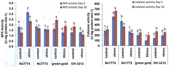 ROS homeostasis is maintained by the activity of antioxidant enzymes produced by plants. Under drought stress conditions, the activities of two antioxidant enzymes viz., catalase (CAT) activity and ascorbate peroxidase (APX) activity, increased to certain folds and gradually kept increasing as the drought stress conditions increased (Figure 5). However, contrasting results were obtained as under day 5 drought stress, CAT activity increased for genotypes NS7774 and OH3312 by 41% and 33%, respectively, as compared to their control, whereas a significant decrease was observed for the other two genotypes, viz., NS7772 and Green Gold, by −40% and 37%, respectively (Figure 5). Similarly, on day 10, the highest catalase activity was for NS7774 by 72%, followed by 10% for OH3312, followed by −32% and −20% for NS7772 and Green Gold, respectively. A similar trend was observed for APX activity, in which NS7774 had the highest amount of APX activity under day 5 and day 10 drought stress condition by 27% and 47%, respectively, as compared to control, whereas for the other three genotypes viz., NS7772, Green Gold and OH 3312, APX activity reduced under drought stress conditions (Figure 5).