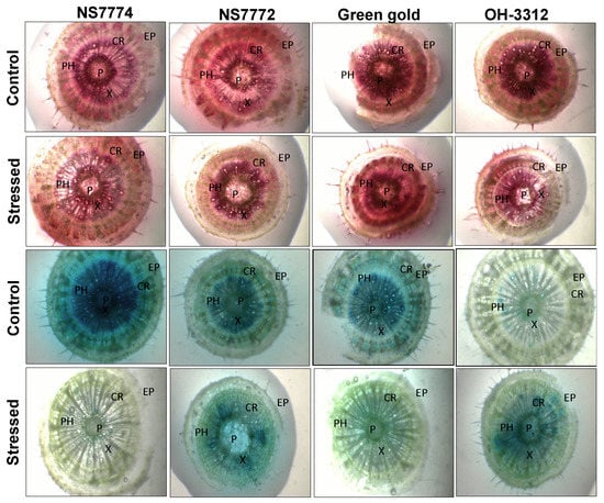 Vascular transport, as affected by drought stress at 5 and 10 days of interval in okra genotypes NS7774, NS7772, Green Gold, and OH3312, along with respective controls. Red and blue food-coloring dyes were used for the absorption process, indicating activity of vascular tissue. EP indicates epidermis; CR indicates cortex; X indicates xylem; P indicates phloem.