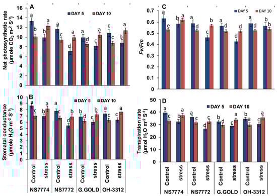 Changes in photosynthetic parameters: (A) net photosynthetic rate (B) stomatal conductance, (C) Fv/Fm, and (D) transpiration rate, as affected by drought stress at 5 and 10 days of interval in okra genotypes NS7774, NS7772, Green Gold, and OH3312, along with respective controls. Vertical bars indicate mean ± SE for n = 5. Means denoted by the different letter are significantly different at p ≤ 0.05 according to the Tukey’s studentized range test.