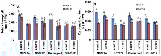 All types of photosynthetic pigments, including chlorophyll content and carotenoid content, gradually decreased with an increase in drought stress from day 5 to day 10. At day 5, reduction in the chlorophyll content was observed, with the least reduction in NS7774 by −29% as compared to the control, followed by −16% in Green Gold, −10% in NS7772 and −1% in OH3312. Similarly, on day 10, chlorophyll content was reduced for all four genotypes compared to their control (Figure 8A).