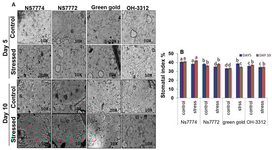 (A) Representative image of stomata, and (B) stomatal index, as affected by drought stress at 5 and 10 days of interval in okra genotypes NS7774, NS7772, Green Gold, and OH3312, along with respective controls at 10X magnification. Vertical bars indicate mean ± SE for n = 5. Means denoted by the different letter are significantly different at p ≤ 0.05 according to the Tukey’s studentized range test.