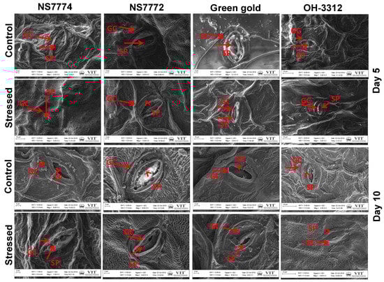 Under 5 days of treatment, closure of stomata was observed but the guard cells remained intact and showed very few significant changes, whereas under 10 days of drought stress treatment, complete closure of stomata along with the guard cells was observed for all the genotypes NS7774, NS7772, Green Gold and OH 3312 (Figure 10). Under 10 days of drought, it was also observed that for genotypes OH3312 and Green Gold, the guard cells were completely damaged (Figure 10).