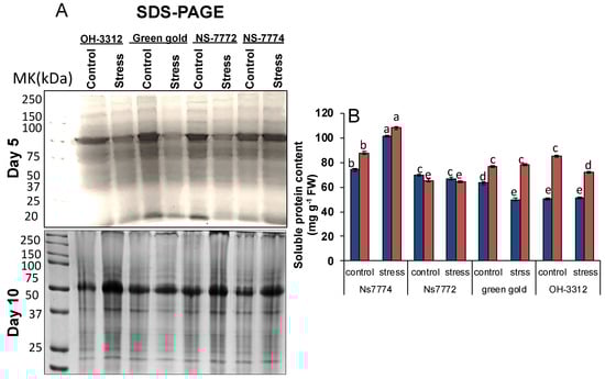 Changes in protein profile (A) SDS-PAGE and (B) soluble protein content, as affected by drought stress at 5 and 10 days of interval in okra genotypes NS7774, NS7772, Green Gold, and OH3312, along with respective controls. Afterwards, proteins extracted from leaves were run on 12% polyacrylamide gel electrophoresis and stained with Coomassie Brilliant Blue R-250. (Vertical bars indicate mean ± SE for n = 5. Means denoted by the different letter are significantly different at p ≤ 0.05 according to the Tukey’s studentized range test.