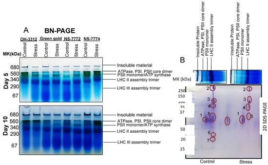 (A) First dimension BN-PAGE, as affected by drought stress at 5 and 10 days of interval in okra genotypes NS7774, NS7772, Green Gold, and OH3312, along with respective controls. (B) 2D-SDS-PAGE of thylakoid protein complex isolated from NS7774 exposed to drought stress for day 10 along with the control samples. For first dimension BN-PAGE, fresh thylakoid membranes of all okra genotypes were solubilized in 1% BDM at chlorophyll concentration of 1µg·µL−1, and the protein sample was separated by 7–12.5% gradient BN-PAGE. For second dimension, gels slices were horizontally laid on top of 12.5% SDS-PAGE and stained with a commercial Coomassie Brilliant Blue R-250 (Bio-Rad, Hercules, CA, USA). Protein identification was based on previous reports and confirmed by MALDI-TOF/TOF-MS, shown in Table 1.