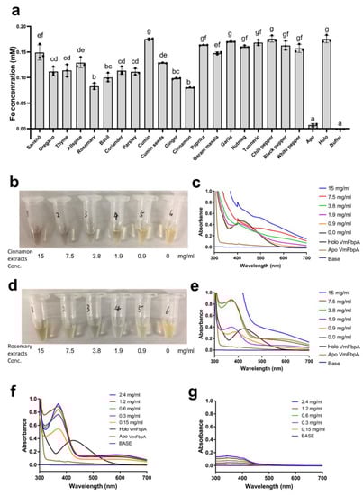 (a) Screening of VmFbpA inhibitors for Fe3+ binding. The gray bar represents the remaining Fe concentration after treatment with the extracts of 20 spices; 10 mM EDTA was used as the negative control. In addition, apo VmFbpA (Apo) and Fe3+-VmFbpA (Holo) were also measured for comparison. Buffer represents the gel filtration buffer (50 mM Tris-HCl (pH 8.0), 50 mM NaHCO3, and 150 mM NaCl) used in VmFbpA purification. Data are means ± SD. Means with the same letter are not significantly different from each other (p < 0.05) (b) Eluents after inhibition assays using cinnamon extracts. (c) Absorbance spectra (300–700 nm) of the respective eluents shown in (b). (d) Eluents after inhibition assays using rosemary extracts. (e) Absorbance spectra (300–700 nm) of the respective eluents shown in (c). Spectra of apo and Fe3+-VmFbpA (controls). (f) Absorbance spectra (300–700 nm) of RA binding to apo VmFbpA. (g) Absorbance spectra (300–700 nm) of RA only. Base is elution buffer containing 50 mM Tris-HCl (pH 8.0), 50 mM NaHCO3, 150 mM NaCl, and 250 mM imidazole.
