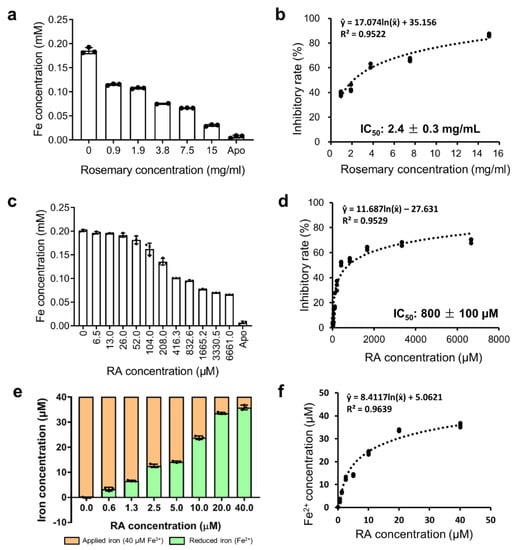 (a) The remaining Fe concentrations in the eluents after inhibition assays using rosemary extracts. (b) Inhibitory rates of rosemary extracts. A nonlinear regression model was performed to fit the concentration (rosemary)—response (inhibitory rate) data. (c) The remaining Fe concentrations in the eluents after inhibition assay using RA. (d) Inhibitory rates of RA. A nonlinear regression model was performed to fit the concentration (RA)—response (inhibitory rate) data. (e) The reduced Fe2+ concentration after adding RA (0, 0.6, 1.3, 2.5, 5, 10, 20, and 40 μM). Orange bar, applied Fe3+ (40 μM). Green bar, reduced Fe2+ from Fe3+ by RA. (f) A nonlinear regression curve fitting of the concentration (RA)—response (Fe2+) data.