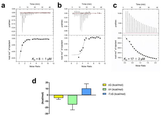 ITC analysis of RA binding to VmFbpA at 298 K. (a) Binding between 10 μM apo VmFbpA and 500 μM RA. (b) Binding between 10 μM Fe3+-VmFbpA and 500 μM RA. (c) Binding between 10 μM apo VmFbpA and 100 μM Fe3+. (d) Thermodynamic parameters for the binding of RA to apo VmFbpA calculated according to the data in (a). The free energy of binding (ΔG, light yellow bar) is the sum of the enthalpic (ΔH, light green bar) and entropic (−TΔS, light blue bar) terms.