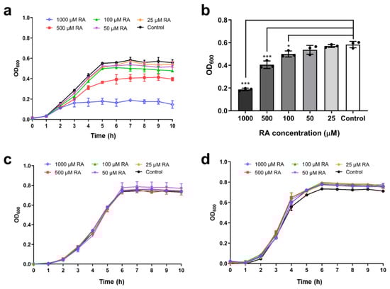 Antibacterial effect of RA. (a) Inhibitory effects of RA on V. metschnikovii growth from 0 to 10 h. (b) Inhibitory effects of RA on V. metschnikovii growth at 7 h. (c) Inhibitory effects of RA on E. coli (KRX) growth from 0 to 10 h. (d) Inhibitory effects of RA on E. coli (BL21(DE3)) growth from 0 to 10 h. RA was used at 0, 25, 50, 100, 500, and 1000 μM. * p < 0.05, *** p < 0.001.