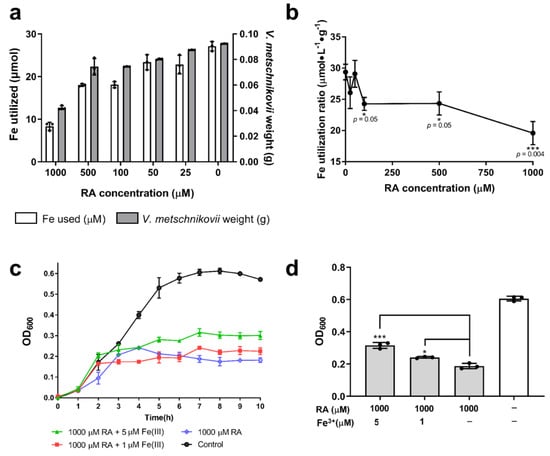 Iron utilization in V. metschnikovii and recovery of V. metschnikovii by adding Fe3+. (a) Weight and iron utilization of V. metschnikovii after 7 h of culture with RA (0, 25, 50, 100, 500, and 1000 μM). (b) Fe utilization ratio of V. metschnikovii after 7 h culture with RA (0, 25, 50, 100, 500, 1000 μM). (c) V. metschnikovii growth from 0 to 10 h in the presence of 1000 μM RA with FeCl3 (10 or 50 μM). (d) Growth recovery of V. metschnikovii at 7 h with 1000 μM RA and supplementation of 1 or 5 μM FeCl3. * p < 0.05, *** p < 0.001.
