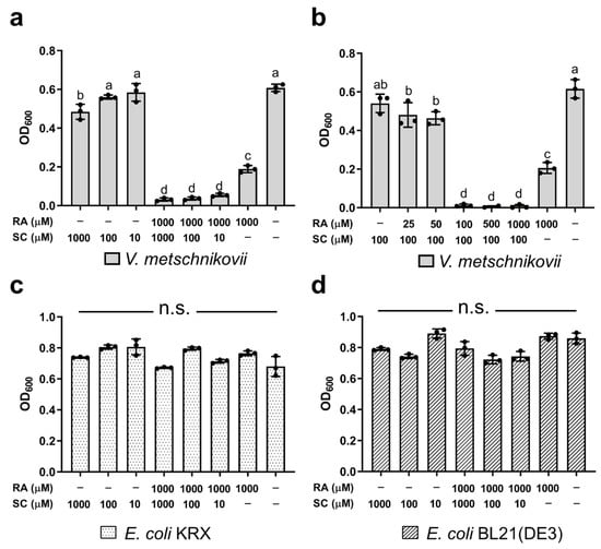 Antibacterial activity of the combination of RA and SC. (a) Dose-dependent effects of SC on V. metschnikovii inhibition with or without 1000 μM RA. (b) Dose-dependent effects of RA with 100 μM SC on V. metschnikovii inhibition. (c) Dose-dependent effects of SC on E. coli (KRX) inhibition with or without 1000 μM RA. (d) Dose-dependent effects of SC with or without 1000 μM RA on E. coli (BL21(DE3)) inhibition. Means with the same letter are not significantly different from each other (p < 0.05). n.s. represents no significant difference.