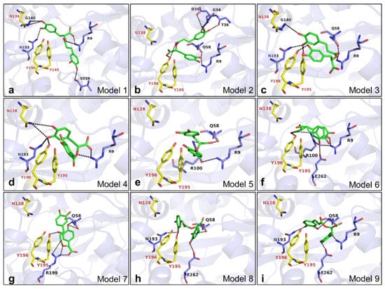 Docking results of RA binding to the Fe3+ binding site of VmFbpA. (a–i) Docking models 1–9 after running docking simulation using AutoDock (version Vina 1.1.2). RA is shown as sticks in green. Fe3+ binding site of VmFbpA (N138, Y195, and Y196) shown as sticks in yellow. The amino acid residues predicted to form hydrogen bonds toward RA are shown as sticks in purple. The hydrogen bonds predicted by PDBePISA are shown as black dashed lines. VmFbpA is shown as a cartoon with a transparency of 60% and colored in purple.