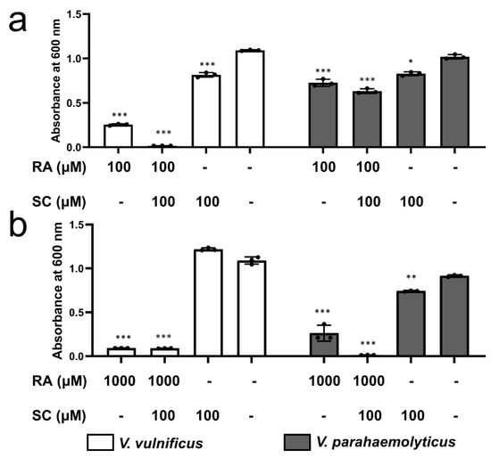Antibacterial effects of RA and SC on V. vulnificus and V. parahaemolyticus. (a) Effect of 100 mM RA with 100 mM SC compared to RA and SC only. (b) Effect of 1000 mM RA with 100 mM SC compared to RA and SC only. The controls did not have exogenous chemicals added. * p < 0.05, ** p < 0.01, *** p < 0.001.