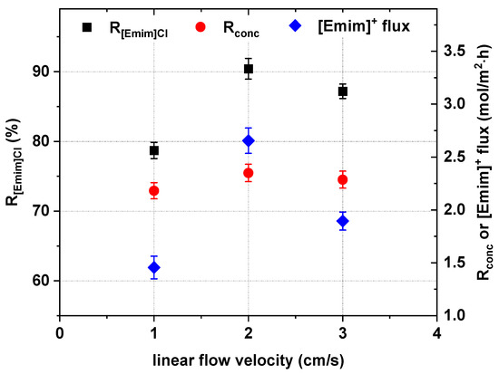 | Initial Diluate Composition | Process | Voltage, V | Flow Rate, L/min | Linear Flow Velocity, cm/s | Diluate-to-Concentrate Volume Ratio | ILs Recovery, % | Transport Rate, mol/h·m2 | Current Efficiency, % | Ref. |
