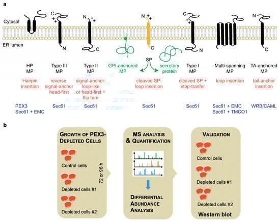 Types of ER membrane proteins and our experimental strategy to address their biogenesis. (a) The cartoon depicts a signal peptide (SP) (in yellow) and six types of ER membrane proteins (MP) (in black), together with their membrane protein type and the mechanism of membrane insertion (both indicated below the cartoon). Cleavable SPs (in yellow) can facilitate the ER import of secretory proteins (in green), glycosylphosphatidylinositol (GPI)-anchored membrane proteins (in green), and several types of membrane proteins, including single-spanning type I membrane proteins. Positively charged amino acid residues (+) play an important role in membrane protein and SP orientation, i.e., they typically follow the positive inside rule []. Amino-terminal transmembrane helices (TMHs) can serve as signal-anchor sequences to facilitate the membrane insertion of type II, type III, and many multi-spanning membrane proteins. In the case of membrane proteins with amino-terminal TMHs, membrane insertion typically involves the same components and mechanisms, which deliver secretory proteins (in green) and GPI-anchored membrane proteins (in green) to the ER lumen. The central component here is the Sec61 complex. In some cases, however, auxiliary membrane protein insertases, such as EMC or TMCO1 complex, play a role. These can also operate as stand-alone membrane protein insertases, an activity that they have in common with the WRB/CAML complex []. Hairpin (HP) proteins have a monotopic topology with N- and C-termini facing the cytosol, and some of them require PEX3 for membrane targeting. C, carboxy-terminus; N, amino-terminus. (b) The experimental strategy was as follows: siRNA-mediated gene silencing using two different siRNAs for each target and one non-targeting (control) siRNA, respectively, with three replicates for each siRNA for 96 h, followed by the label-free quantitative analysis of the total cellular proteome, and then differential protein abundance analysis to identify negatively affected proteins (i.e., putative clients of the target) and positively affected proteins (i.e., putative compensatory mechanisms), and finally validation by Western blot. In addition, PEX3-deficient Zellweger patient cells were analyzed in triplicates.