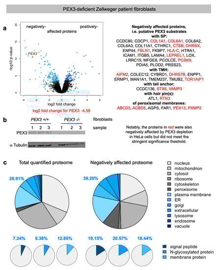 Here, we addressed the question of which precursor polypeptides employ the PEX3-dependent pathway for the targeting of or insertion and translocation, respectively, into the ER of human cells. First, we employed our previously established approach of the siRNA-mediated depletion of PEX3 in HeLa cells, the label-free quantitative MS of the total cellular proteome, and differential protein abundance analysis. Next, we quantified the negatively and positively affected proteins under conditions of PEX3 deficiency in Zellweger patient fibroblasts.