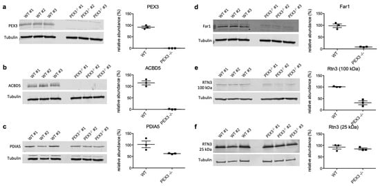 Validation of the PEX3 clients by Western blot analyses. (a–f) Three independent cell lysates from the control (WT) and PEX3-deficient fibroblasts (PEX3−/−), respectively, were analyzed by Westen blotting using antibodies as indicated. Left panels: Relevant sections of the representative Western blots are shown; tubulin served as a loading control. We note that the full scans of all of the blots are shown in the supplement. Right panels: The scatter plots indicate the relative protein abundances in the control and PEX3-deficient fibroblasts, as derived from quantitative Western blots, as shown in the left panels. The signals were quantified by densitometry, and the relative abundances were calculated as the ratio of the signal of interest to the corresponding tubulin signal in the same lane, and were normalized against one control sample. The mean values with SEM from three independent lysates per cell line are indicated, as well as the individual data points for each replicate.