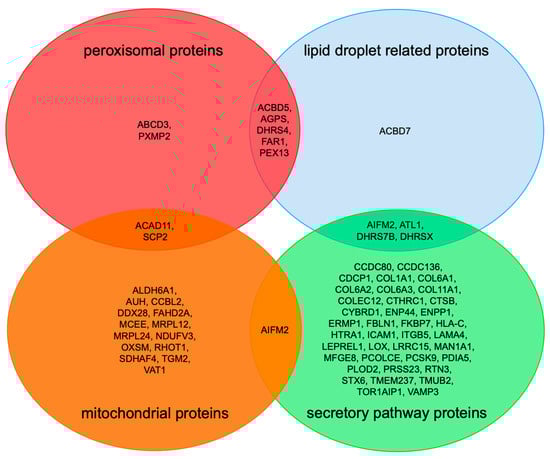 Under conditions of PEX3 deficiency in Zellweger patient fibroblasts, the results were more informative (Figure 2). First, the negatively affected proteins included twelve precursors of proteins with a functional location on or in peroxisomes, including six peroxisomal membrane proteins (Figure 4, Table 3). This was expected, and demonstrated once more the feasibility of the approach. However, this does not mean that all of these precursors of peroxisomal proteins are targeted to the ER. Rather, at least for the peroxisomal matrix proteins, it must be due to the complete absence of peroxisomes from the patient fibroblasts with PEX3 deficiency [,,]. Likewise, we cannot rule out that the depletion of some precursors could derive from transcriptional effects. However, we consider this unlikely, as previous transcriptomics studies revealed that solely the absence of peroxisomes does not generally result in global mRNA expression changes [].